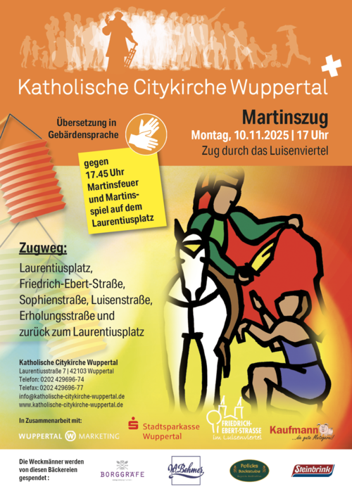 Die Katholische Citykirche Wuppertal sucht für den Wuppertaler Martinszug, der am Montag, dem 10.11.2025 um 17 Uhr auf dem Laurentiusplatz in Wuppertal-Elberfeld startet, wieder Fackelträger und Zugordner, die den Zug begleiten. Interessenten können sich ab sofort unter 0202-42969674 oder per Mail an martinszug@katholische-citykirche-wuppertal.de melden.
