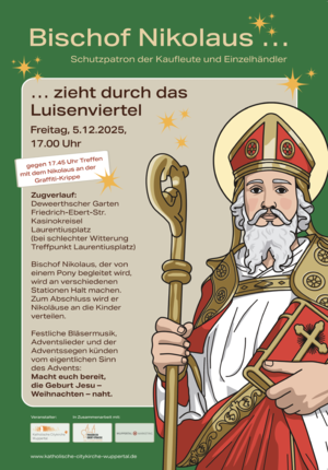Gemeinsam mit der evangelischen Citykirche Elberfeld lädt die Katholische Citykirche Wuppertal am Freitag, dem 28. November 2025, dem Vorabend des 1. Advent, um 18.30 Uhr zu einem ökumenischen Gottesdienst zur Eröffnung des Kirchenjahres in die Citykirche Elberfeld (Kirchplatz 1 in Wuppertal-Elberfeld) ein.